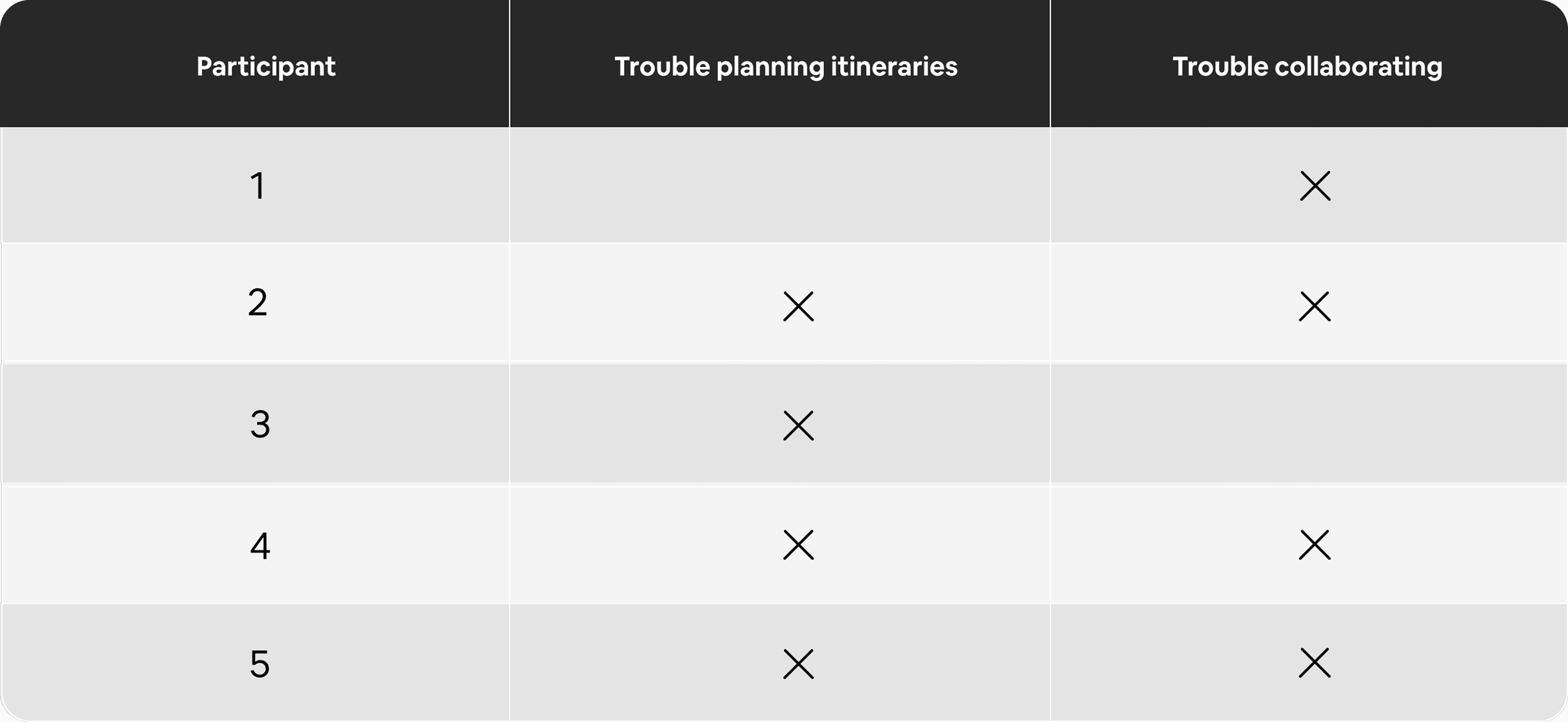 We started with 5 user interviews and affinity mapping to validate our initial hypothesis around trip-planning pain points.