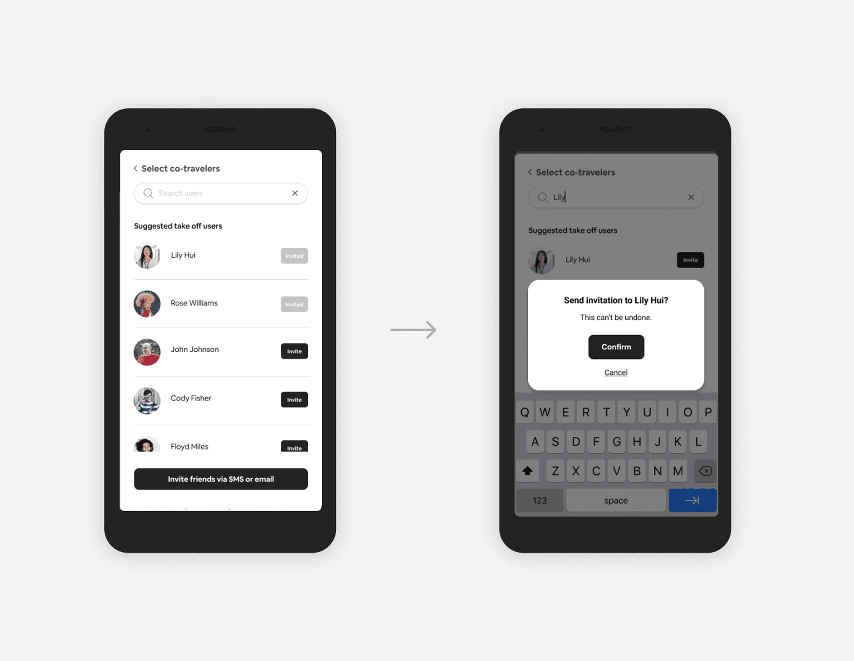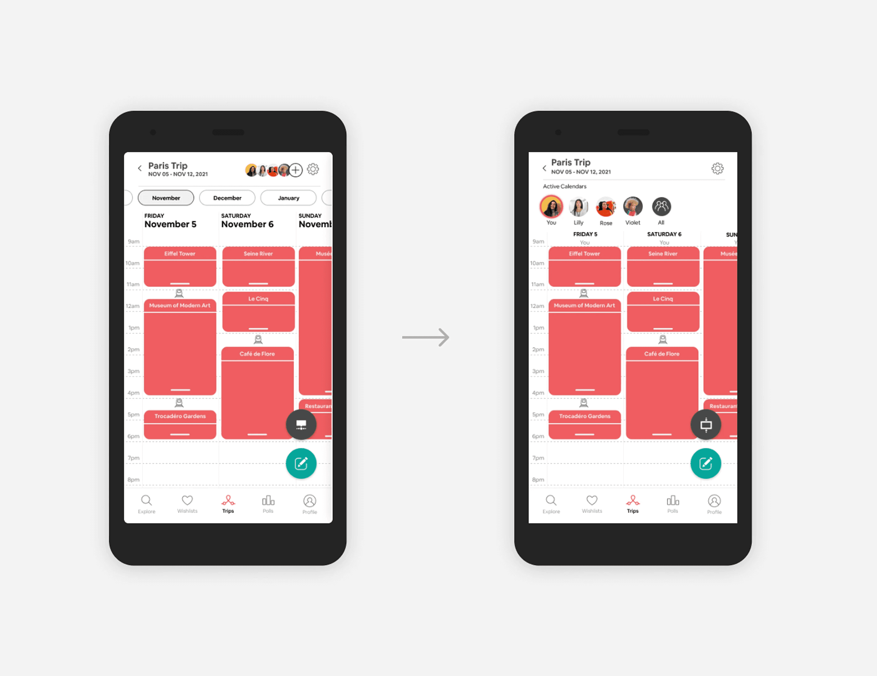 My main focus was the co-traveler itinerary flow, which supported one of the strongest research needs: helping people understand not only their own plan, but everyone else’s too.