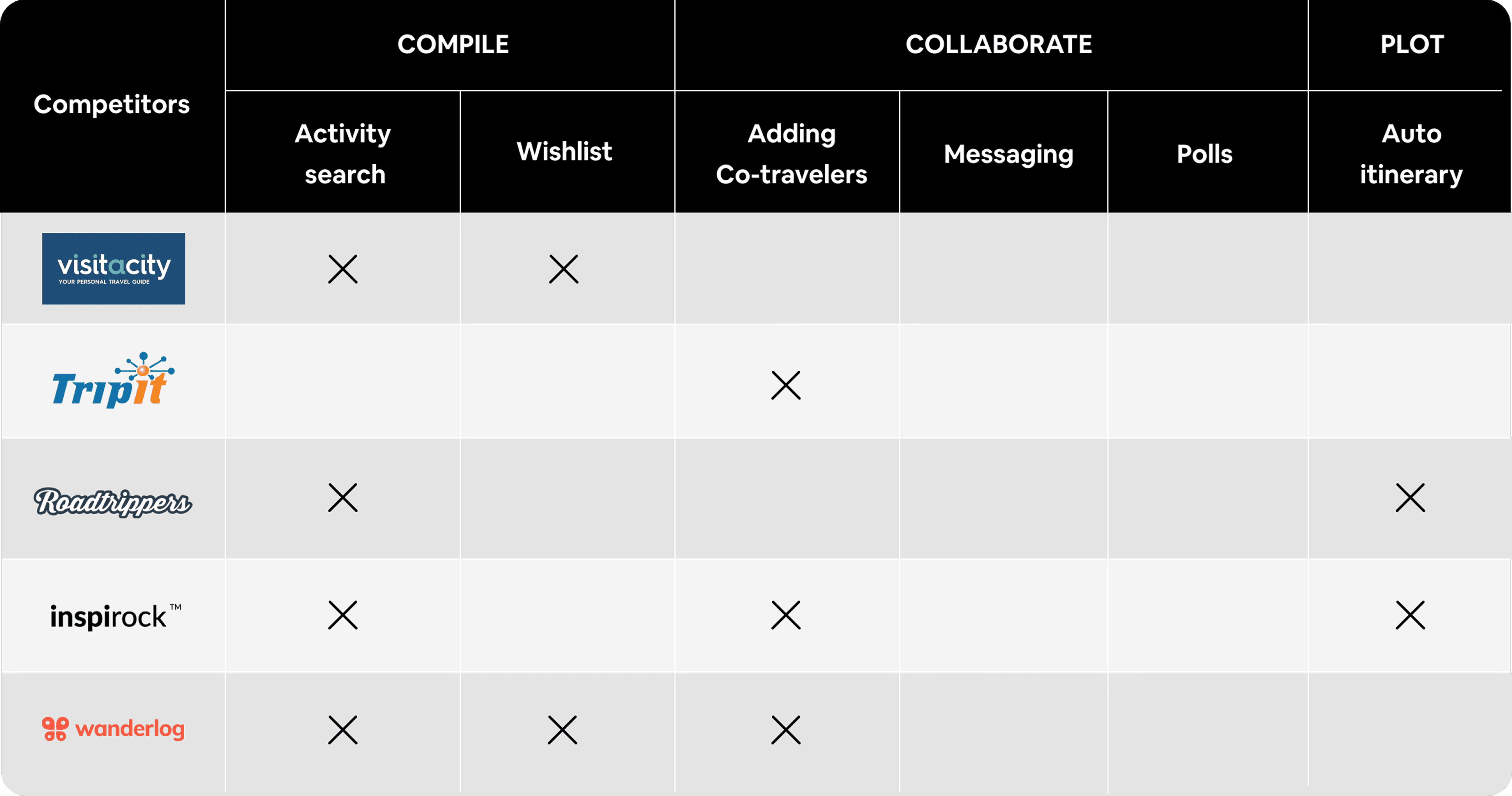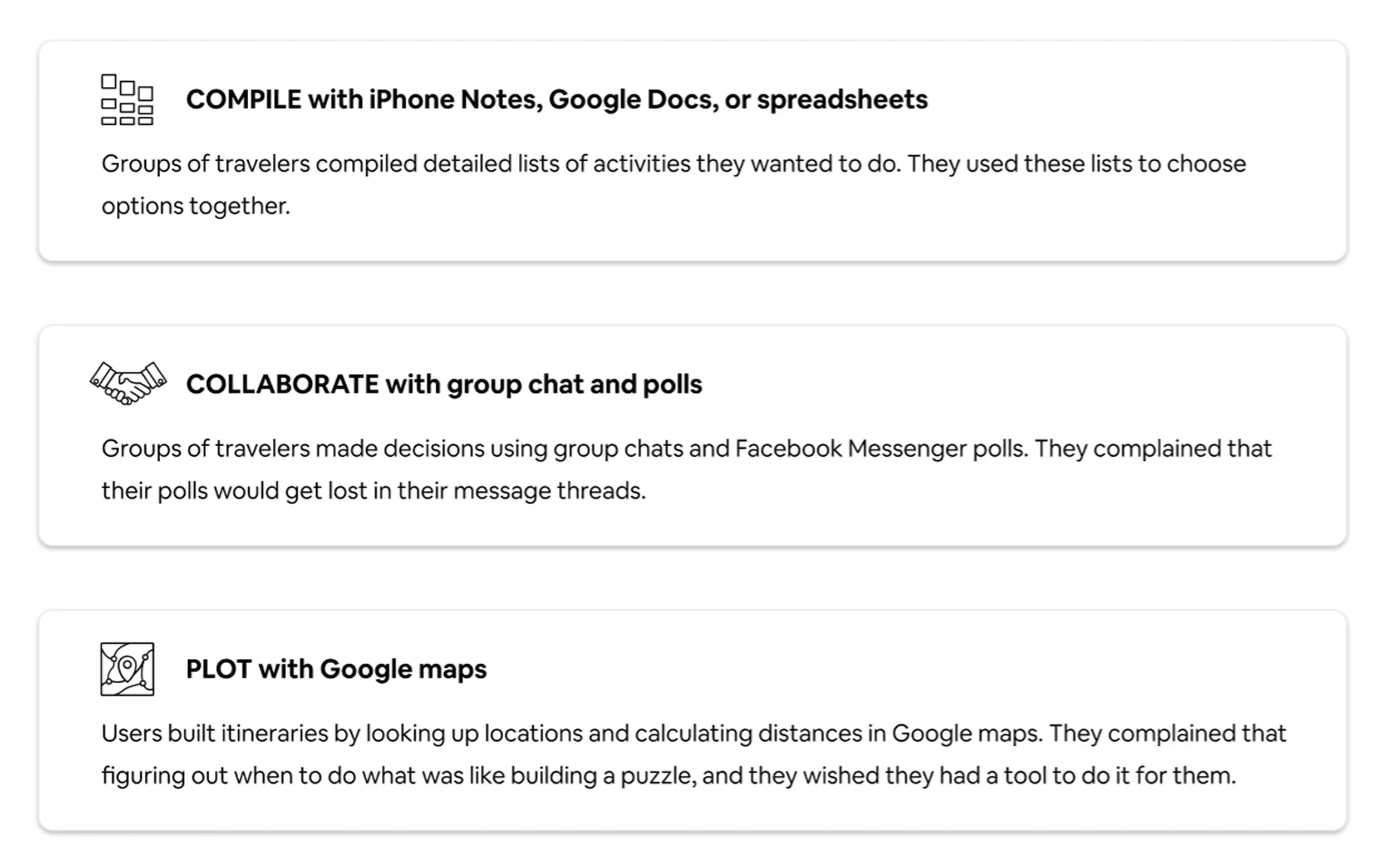 We found that no existing product supported the full trip-planning workflow in the way users were already behaving. Some tools supported discovery, some supported scheduling, and some supported collaboration, but none brought those behaviors together clearly.